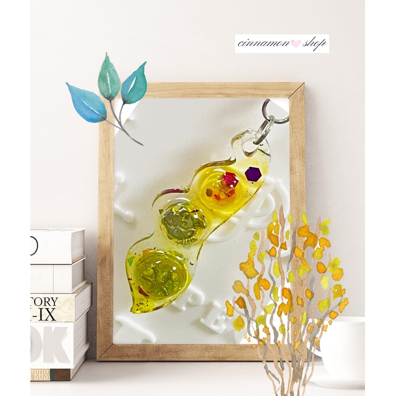 レジンを使用したキラキラした、夏イメージの海の仲間が入った、可愛いイエローのソラマメのマスクチャームを制作しました(๑╹ω╹๑ )