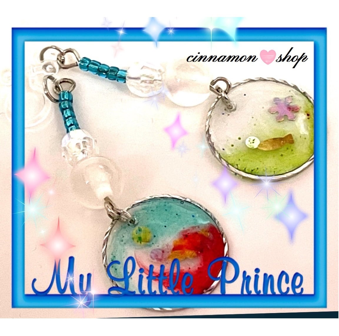 レジンに❄️雪の結晶とおさかなさんが入った丸枠のイヤリングになります♬