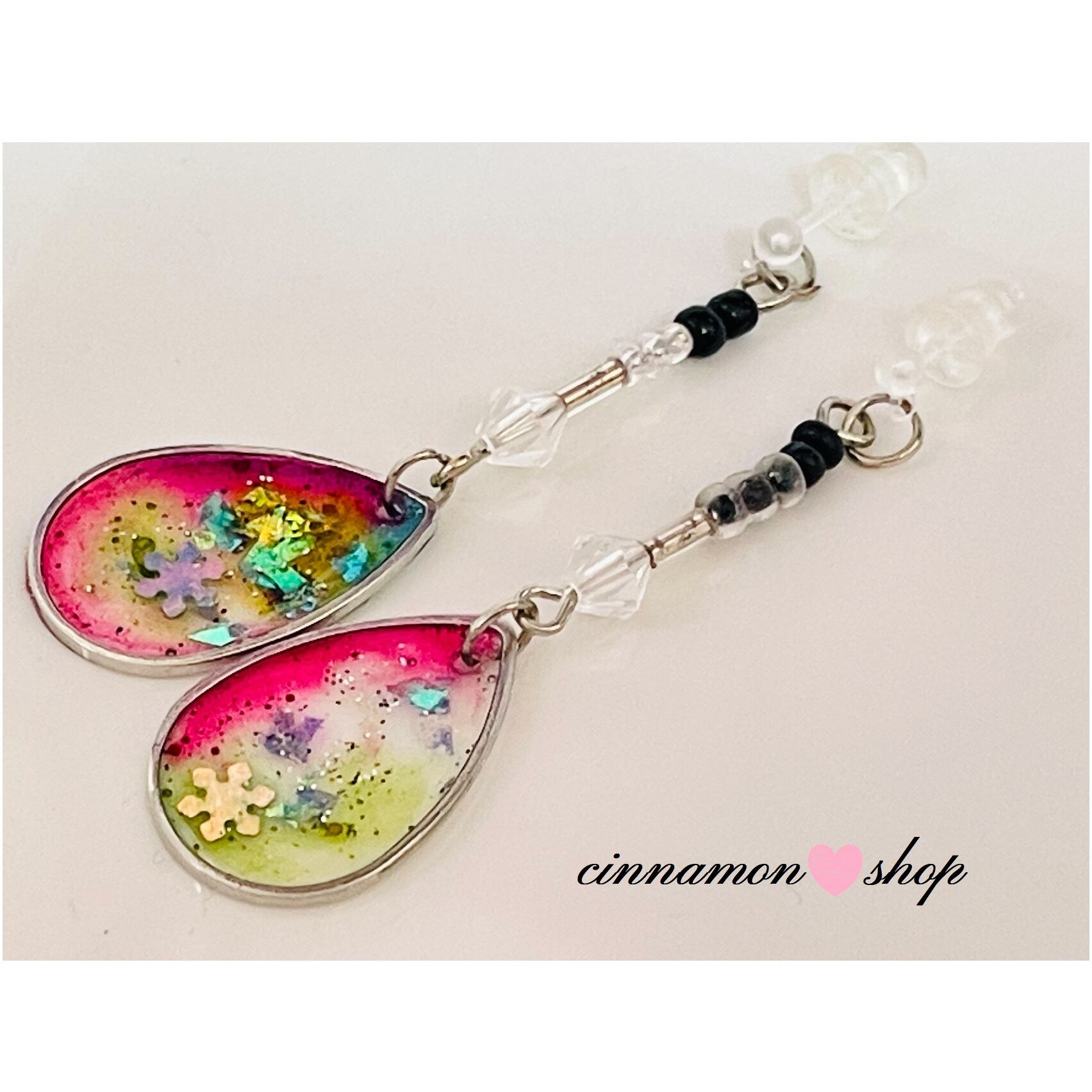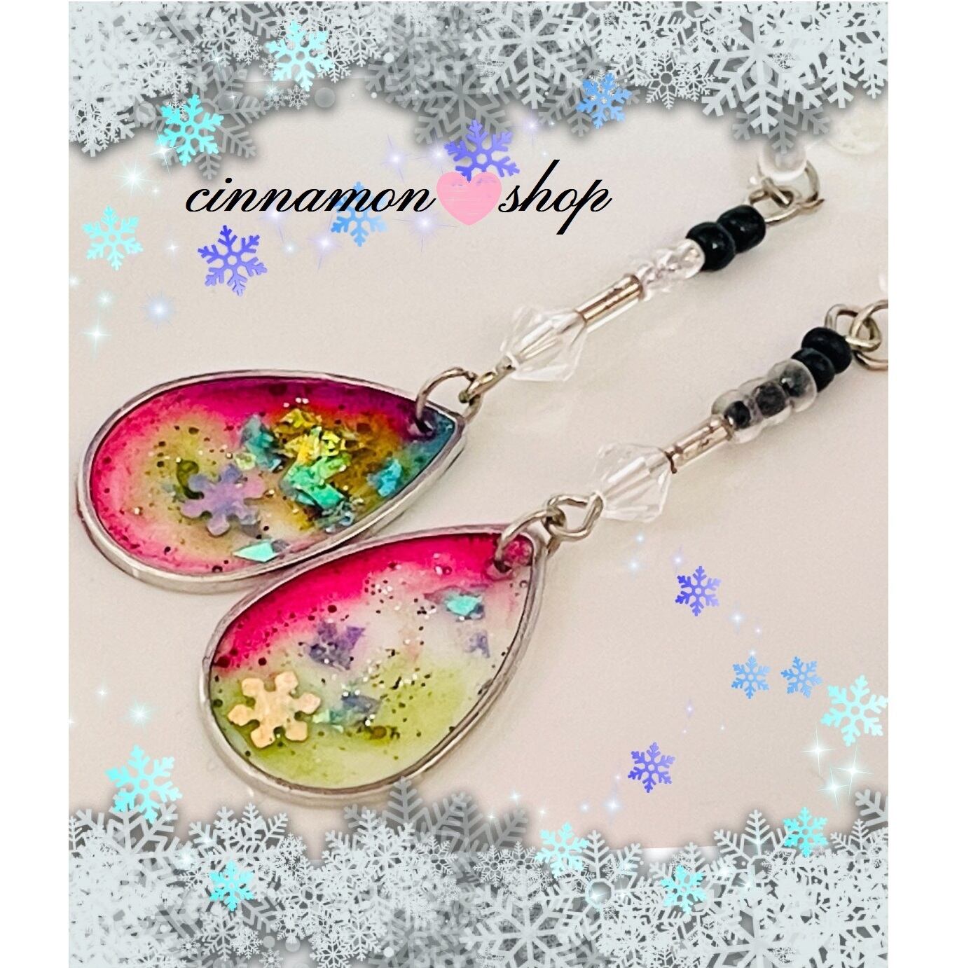 レジンとビーズを使った❄️雪の結晶が入った、しずく型ピアスになります♬