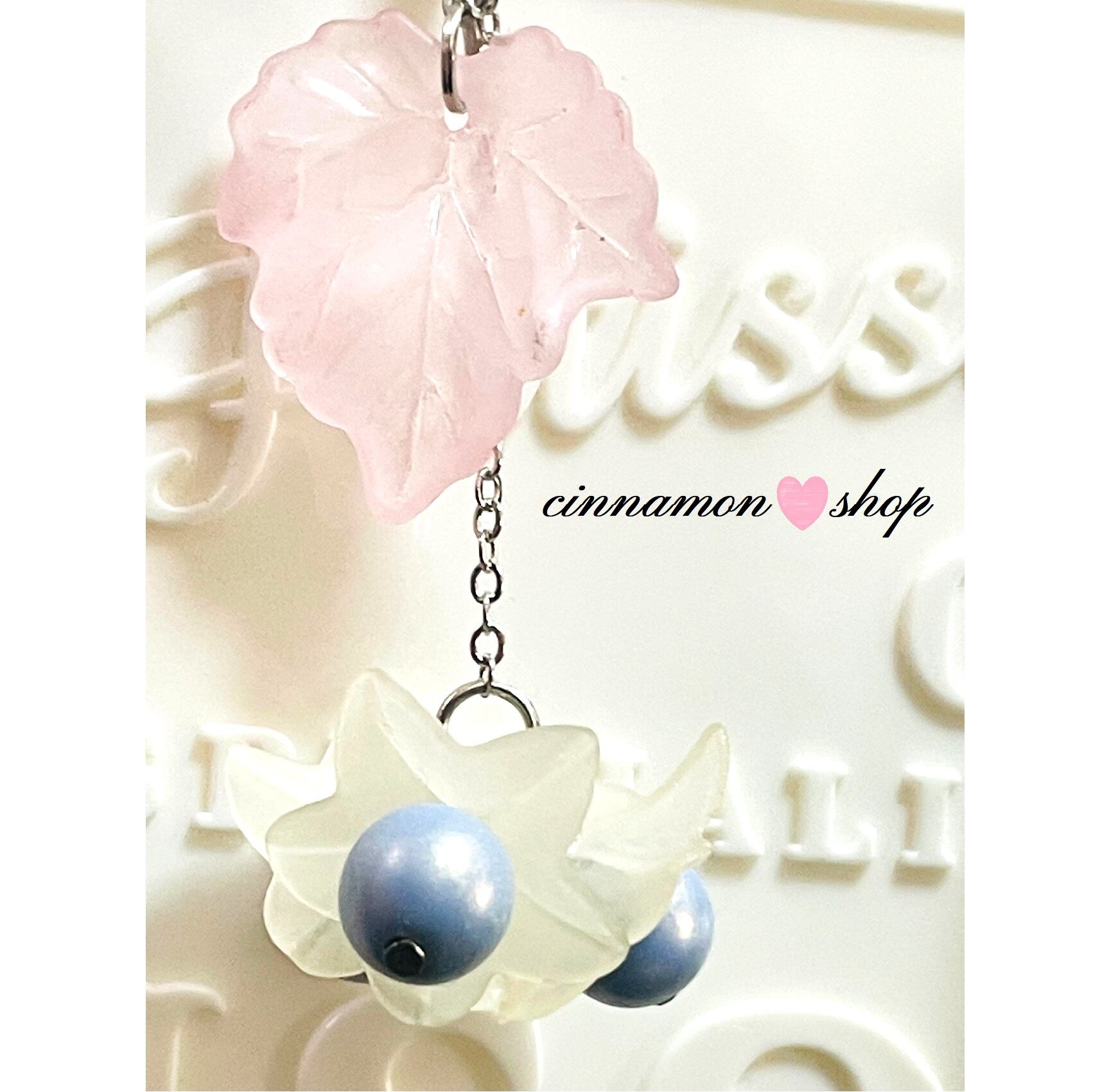 ビーズ&ホワイトのアクリルのお花に、アクリルのピンクのリーフが付いてるチャーム(๑╹ω╹๑ )