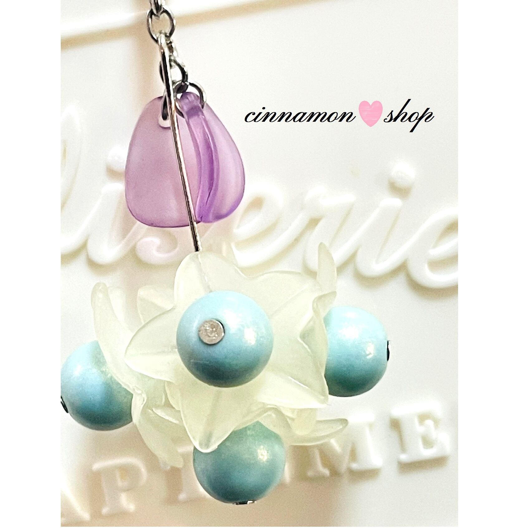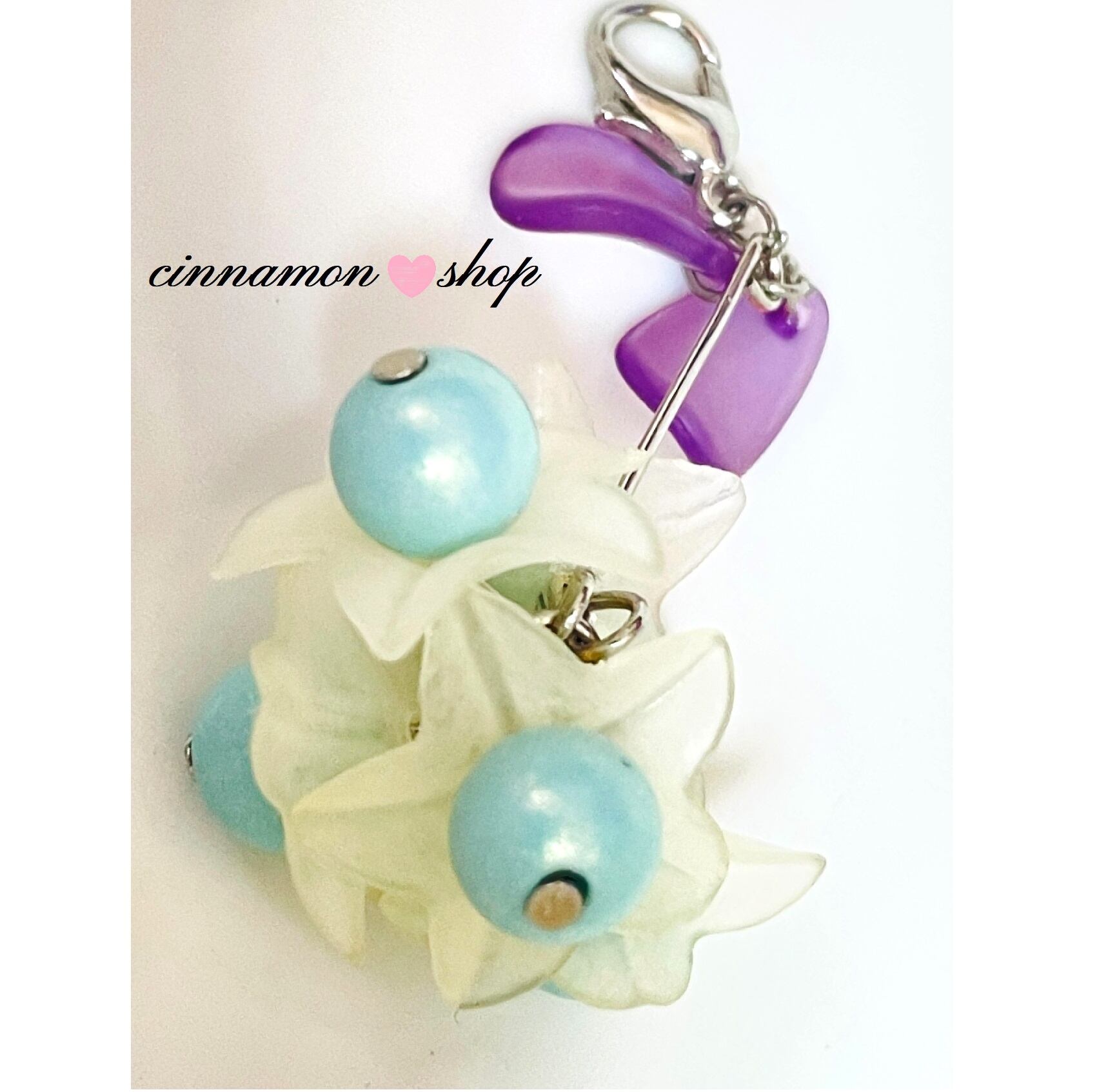 ライトブルーのビーズ&ホワイトのアクリルのお花に、アクリルのパープルの花びらが付いてるチャーム(๑╹ω╹๑ )