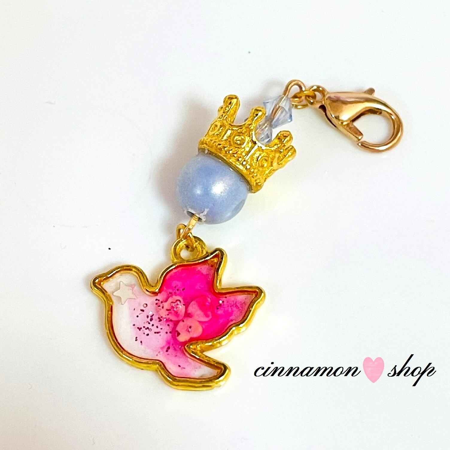 ✨可愛い鳩型のレジン&ブルーのビーズが付いてる王冠のチャームを製作いたしました(*´▽`*)